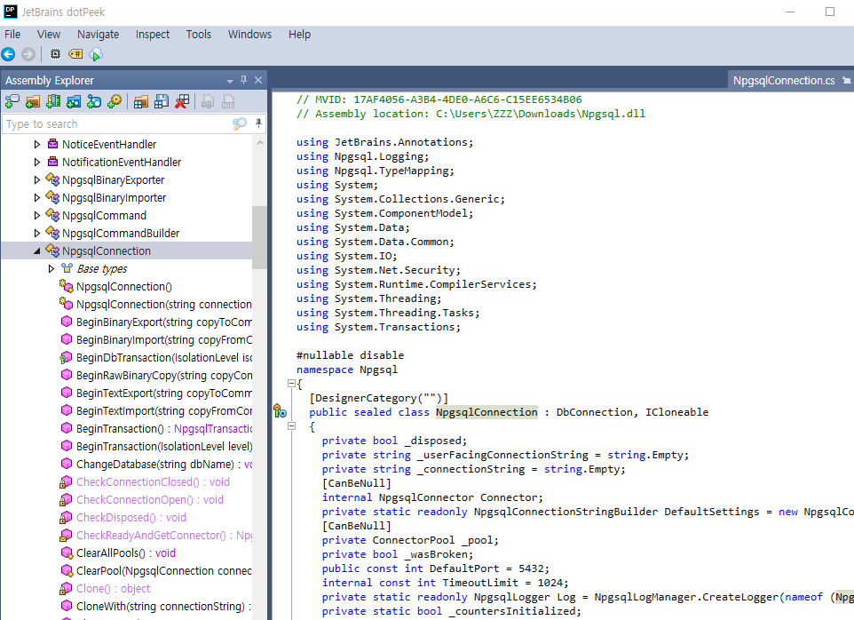 아까 C# 에서 참조했던 NpgsqlConnection 클래스 소스를 확인할 수 있다.